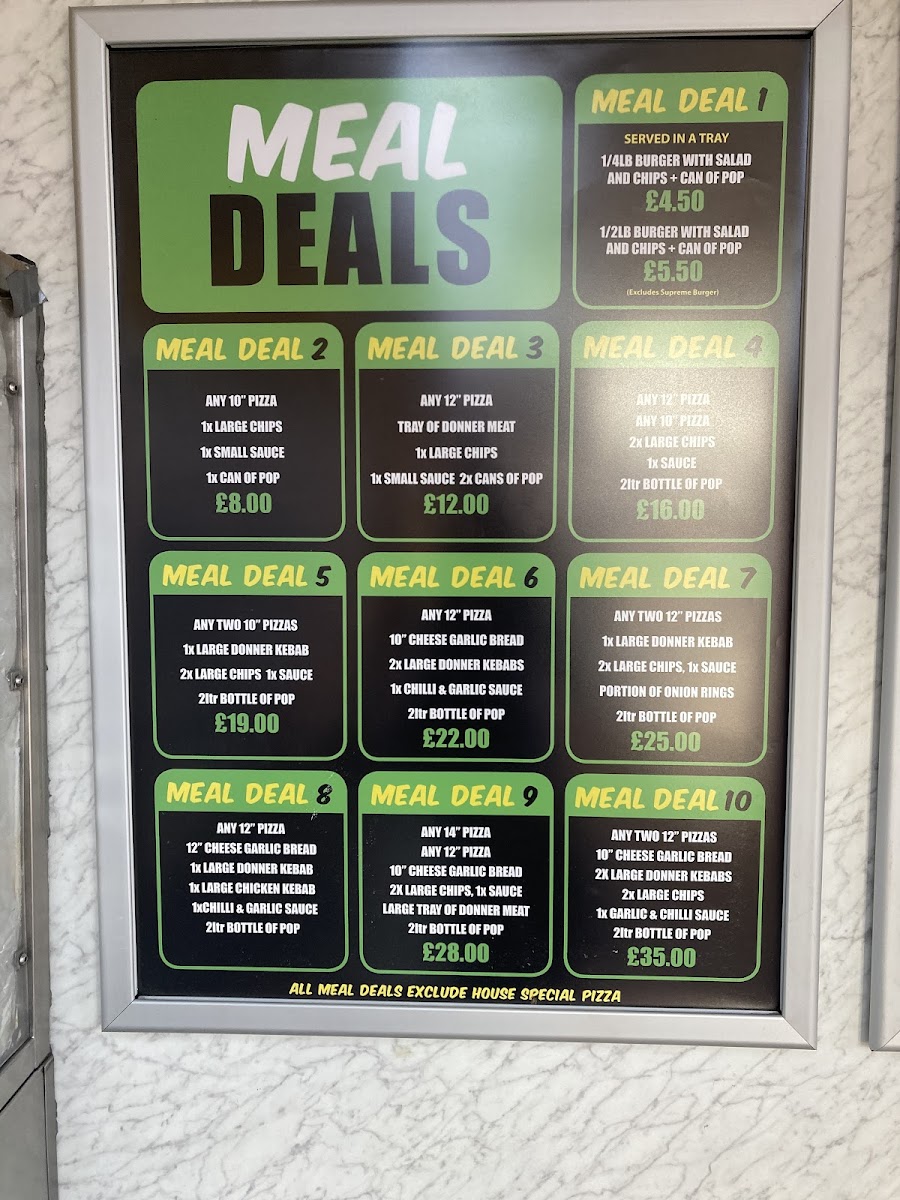 From a reviewer’s perspective, the menu at Gill’s Fish And Chips keeps things simple with a clear focus on value-oriented combinations, particularly through its meal deals. Options such as Meal Deal 2, Meal Deal 3, Meal Deal 5, Meal Deal 6, and Meal Deal 8 provide convenient bundled choices that are ideal for customers looking for a complete, satisfying takeaway without having to choose individual items separately. While the menu information is brief, the variety in the numbered deals suggests there are options suited for different appetites and group sizes, making it easy for both individuals and families to find something suitable. Overall, the meal deal selection forms the core of the menu, emphasizing affordability, convenience, and the classic fish and chips experience the shop is known for.